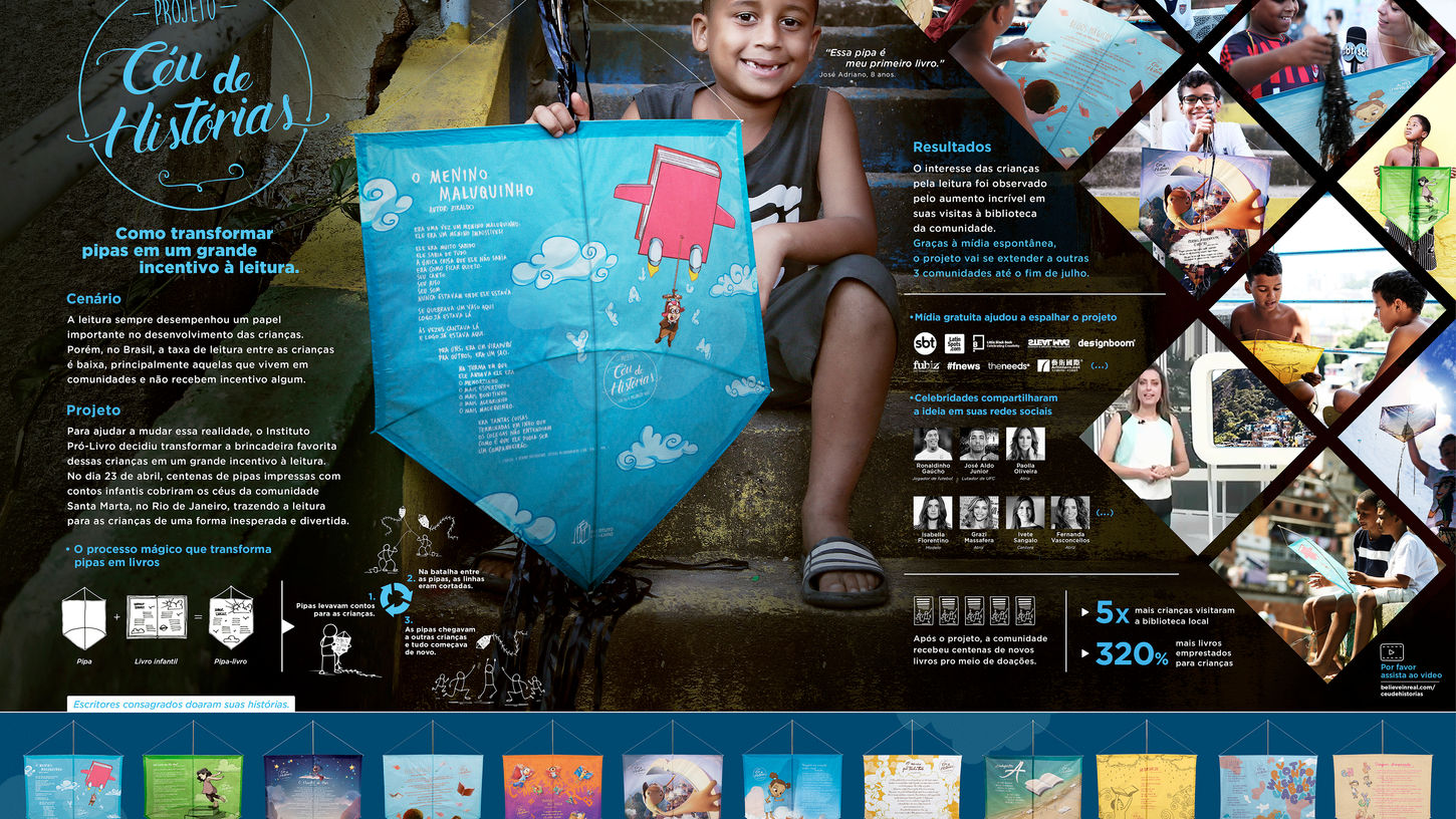 Hundreds of kites printed with children's stories covered the skies of the Santa Marta community in Rio de Janeiro, bringing reading to children in an unexpected and fun way.